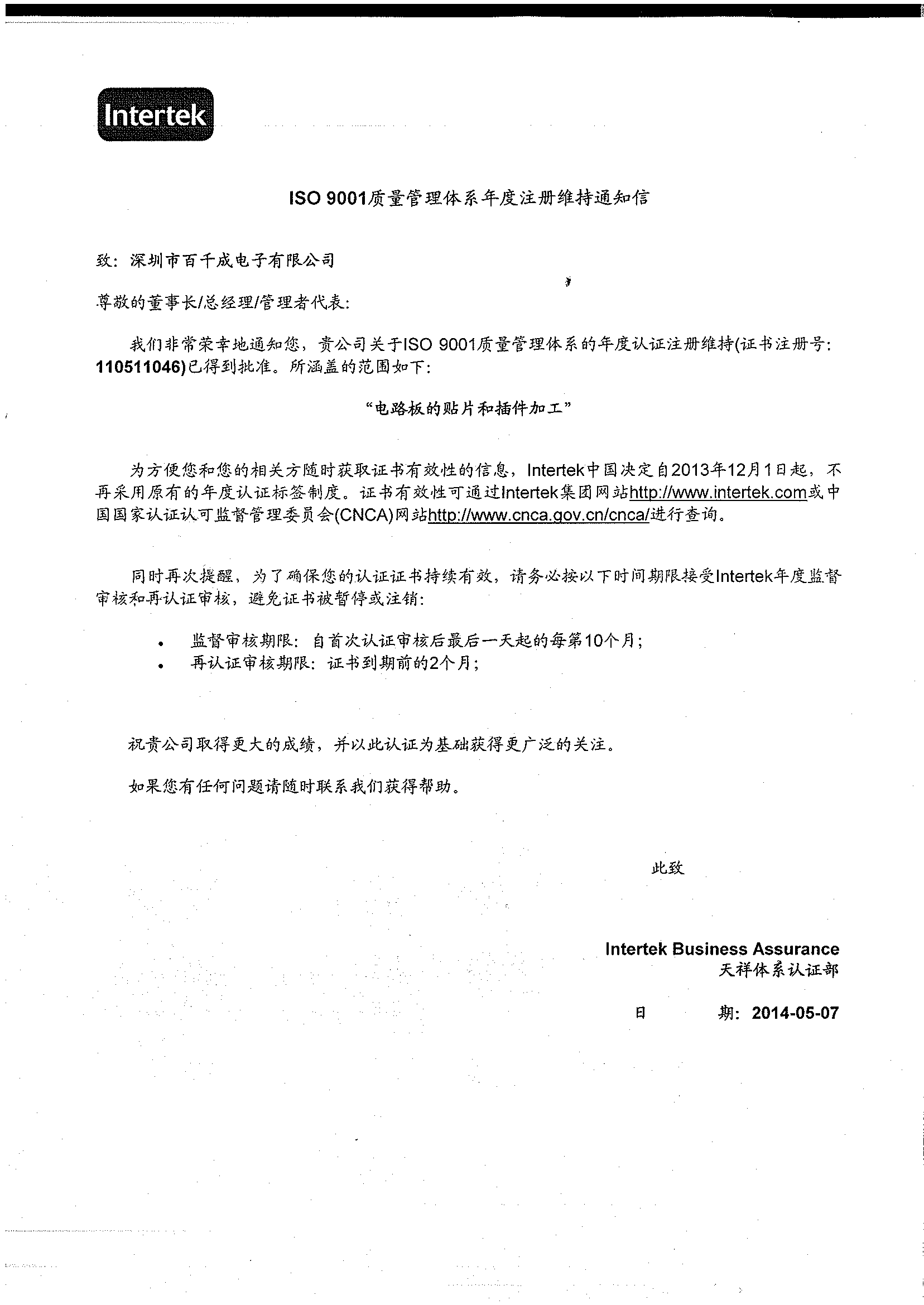 2014年4月百千成電子有限公司通過Intertek 天祥集團(tuán)認(rèn)證公司ISO9001:2008年度審核!